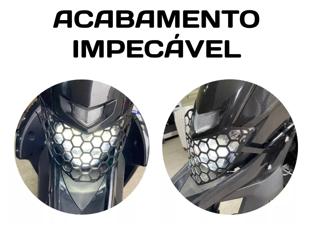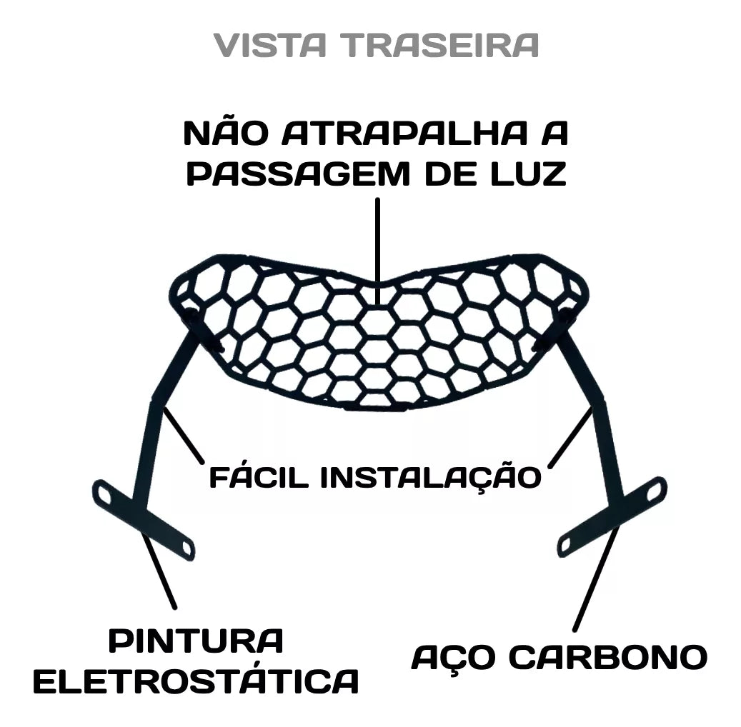 O protetor de farol GPI foi desenvolvido para proteger o farol de sua moto, que é uma parte muito suscetível a impactos, desde pancadas até mesmo a pedras do asfalto que são projetadas nela. Ela não prejudica de forma alguma o funcionamento do sistema de iluminação, pois tem espaçamentos para a passagem de luz, além de dar um visual esportivo e personalizado para a sua moto.